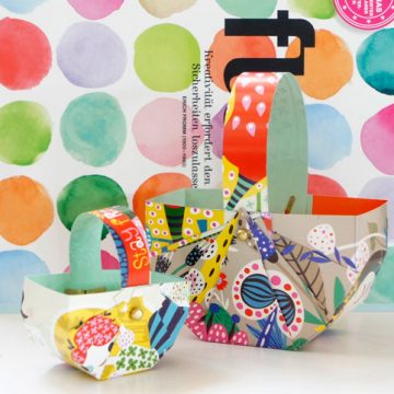 Die Körbe können, wenn es ganz schnell gehen soll, auch ohne den Stoffbezug gebastelt werden. Verwende buntes etwas festeres Papier aus Zeitschriften oder Bastelkarton dafür.