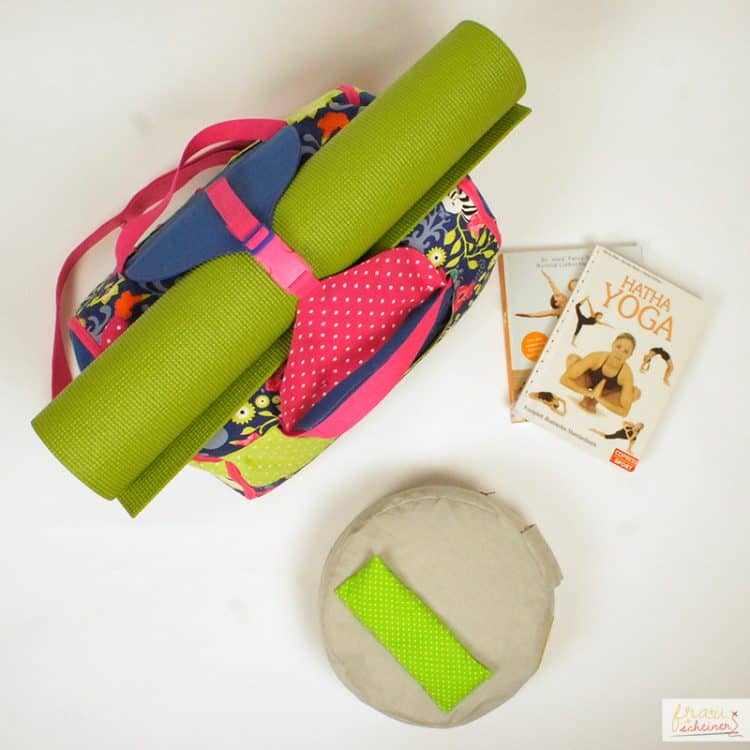 ich bin ganz aufgeregt und freue mich sehr endlich eine neue Näh-Idee in den Startlöchern zu haben. Wieder einmal kamen mehrere Gründe zusammen, weshalb ich die praktische und ausgefuchste Sporttasche Yogini nähte. Die Idee, eine Tasche zu nähen, die sich bei Bedarf vergrößern lässt, habe ich schon lange. Seitdem ich zum Sport meine komplette Yoga-Pilates-Ausrüstung mitnehmen muss, hatte ich noch einen ganz lebensnahen Grund, die Idee endlich umzusetzen. Ich brauche eine Tasche in die ein Pilates Ball, ein Yogakissen, Tennisbälle, eventuell ein dünne Decke und eine Yogamatte passt. Die Yogamatte muss praktisch verstaut werden, ohne langes hineinstecken oder umhüllen. Außerdem dachte ich auch daran, dass ich oft noch einkaufen fahre. Oder, wenn ich schonmal unterwegs bin, noch etwas zusätzlich mitnehmen und einstecken will. Eine Tasche also, die als eierlegende Wollmilchsau dient.