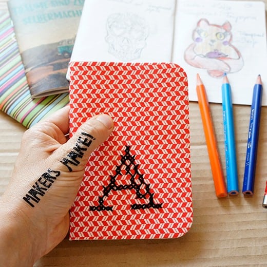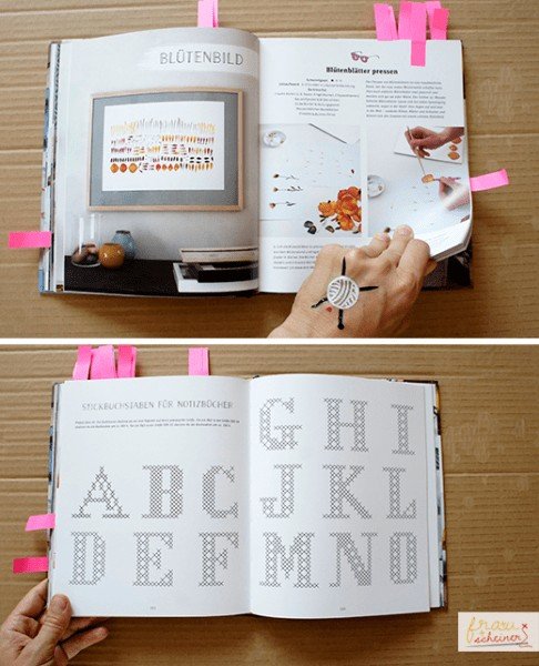 Die hübschen Hefte von lemon books (übrigens auch ein Unternehmen von Cathi und Sophia), aber natürlich auch andere, wie ihr auf dem Foto sehen könnt, lassen sich wunderbar mit einem gestickten Buchstaben personalisieren und aufwerten. Ein Vorlagebogen am Ende des Buches erleichtert das Sticken sehr.